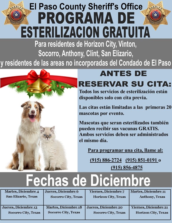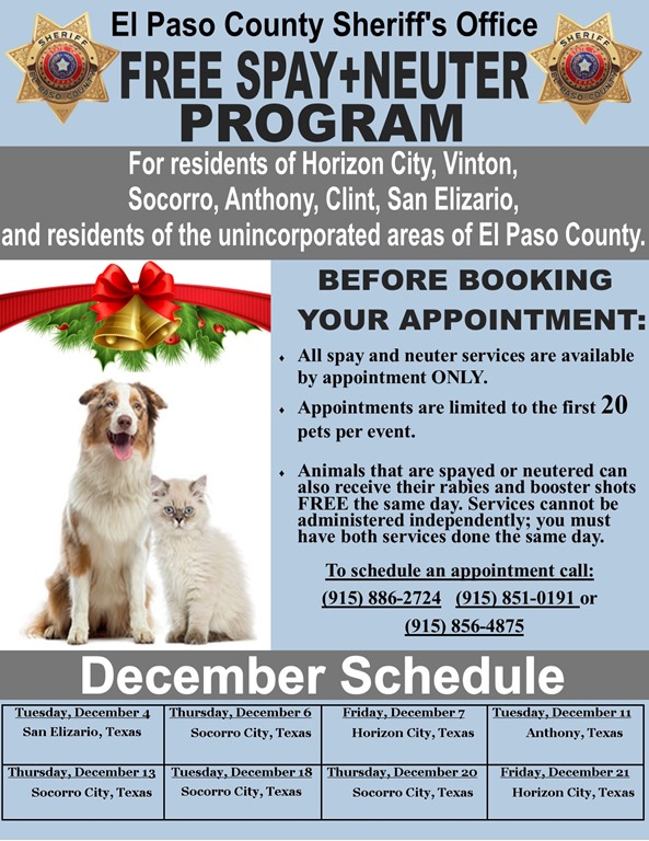 EL PASO COUNTY SHERIFF’S OFFICE SPAY AND NEUTER PROGRAM DECEMBER SCHEDULE