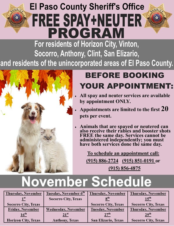 El Paso, TX- The El Paso County Sheriff’s Office has launched a FREE Spay and Neuter Program for residents of El Paso County.