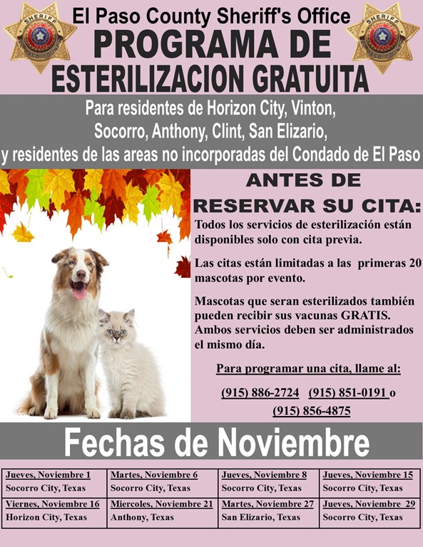 The spay and neuter program is open to residents of Horizon City, Vinton, Socorro, Anthony, Clint, San Elizario, and residents of other unincorporated areas within El Paso County.