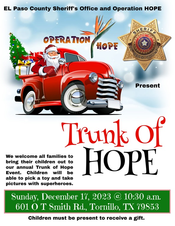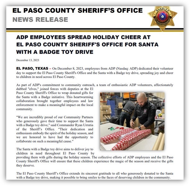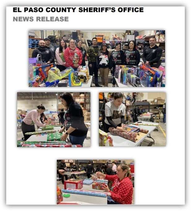 The El Paso County Sheriff's Office cordially invites us to join the esteemed endeavor, the SANTA WITH THE BADGE TOY DRIVE. We humbly request your participation in our pursuit to collect gifts that serve as a source of delight for the less fortunate this forthcoming holiday season. Please feel free to visit any of our patrol stations and deposit your gift in the designated "Santa with a badge" box in the lobby. Your generous contributions shall be distributed amongst El Paso County children and families seeking additional yuletide merriment. Whether it is a toy or a cozy winter blanket, each donation carries significance. Let us unite as a community and endeavor to bring greater joy to those most in need during this holiday season.