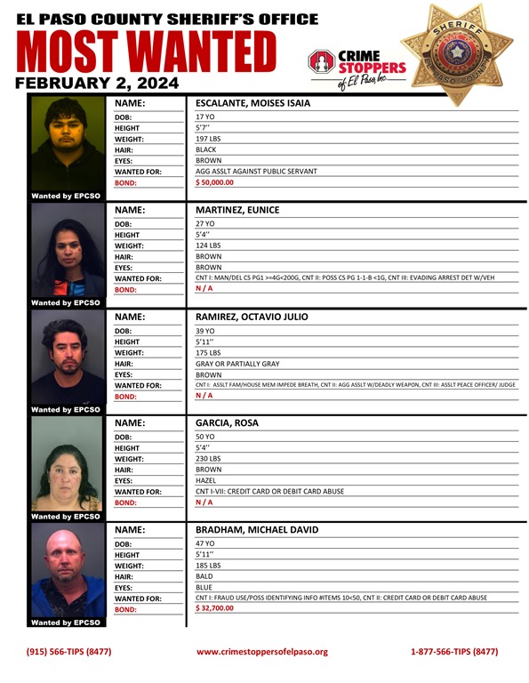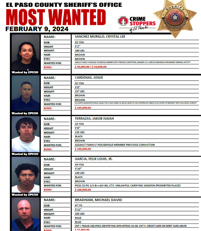 EL PASO, TEXAS – Crime Stoppers of El Paso, Inc., distributes fugitives wanted by the El Paso Police Department and the El Paso County Sheriff’s Office every week through the Most Wanted feature. The attached fugitives are individuals, where attempts in locating them for one reason or another have been unsuccessful. The agencies submit these fugitives to Crime Stoppers of El Paso, Inc., which distributes them to the news media and offers the use of the Crime Stoppers hotline for information regarding the whereabouts of these fugitives. Anyone with information on the location of any of these fugitives should call Crime Stoppers of El Paso immediately at (915) 566-8477 (TIPS), or submit the information on-line at www.crimestoppersofelpaso.org. You will remain anonymous, and if your tip leads to an arrest, you can qualify for a cash reward. Crime Stoppers of El Paso, Inc., is a non-profit organization that brings together the community, law enforcement, and the media to solve crime.