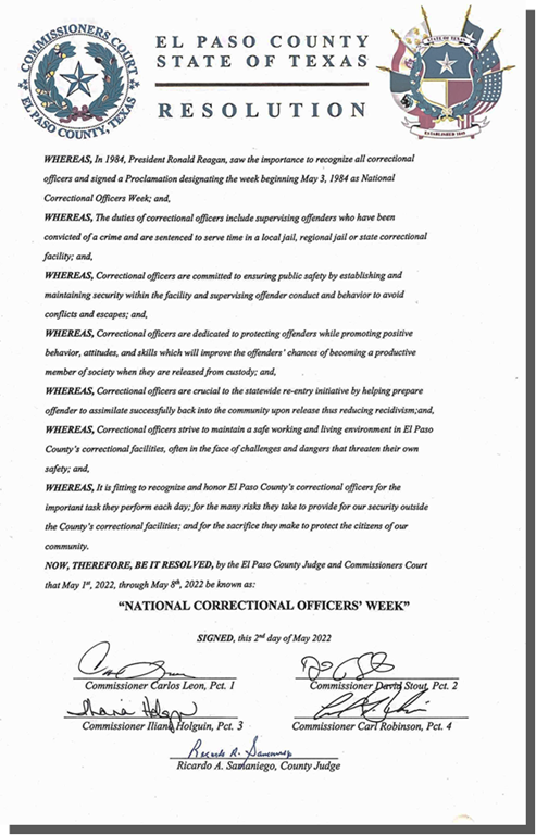 El Paso, Texas – The El Paso County Sheriff's Office Celebrate and Recognize National Correctional Officers Week. National Correctional Officers Week recognizes the contributions of correctional officers and personnel who work in jails, prisons, and community corrections across the country. On Monday, May 2, 2022, El Paso County Commissioners read and signed a resolution declaring May 1st – May 8th, 2022, as “National Correctional Officers' Week” in El Paso County.